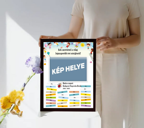 Fényképes és névre szóló falikép óvó néninek, dadus néninek a gyerekek nevével feliratozva. A nevek száma, a háttér és a grafika változtatható.