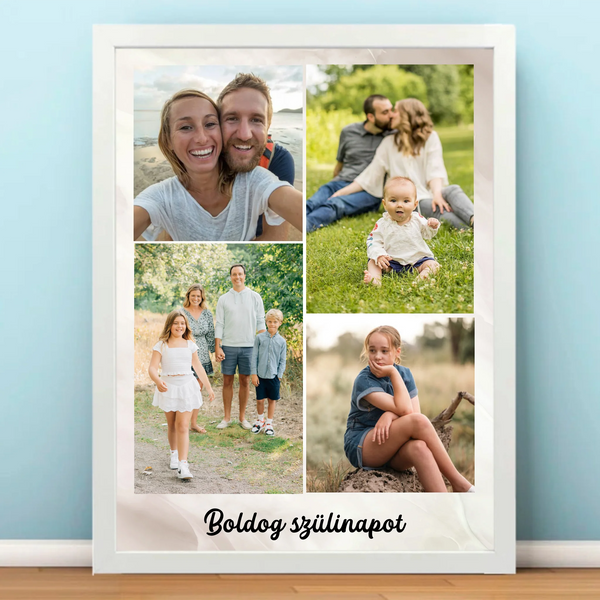 Klasszikus 4 képes falikép montázs szülinapra, egy ideális családi ajándék, hogy megőrizd a legszebb közös perceket. Egy hétköznapi, szívhez szóló dekorációs tárgy, melyre rápillantva mindig eszedbe jutnak majd a legfontosabbak személyek. Családtagoknak és barátoknak egyaránt adható szuper meglepetés. Szülinapra, névnapra, karácsonyra, évfordulóra, Nő napra, Anyák napjára, Apák napjára vagy bármely más jeles alkalomra az egyedi képes ajándék mindig tökéletes választás.